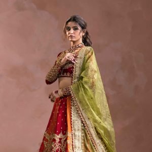 Duppatta: Organza, zari tilla, resham, and sequins embroidery with finishes