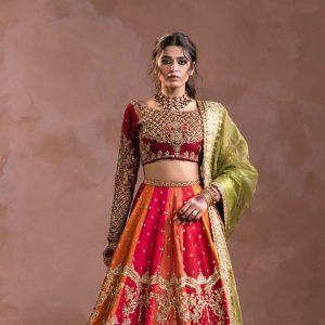 Lehnga: Indain raw silk fabric, with zari tilla, resham and sequins embroidery on front and back panels with additional hand embellishment on lehnga front panels